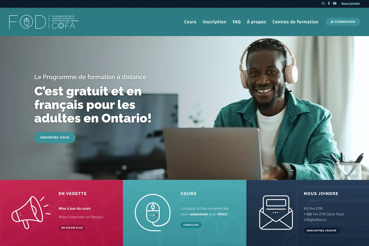 Design et développement du site web pour le Service d’enseignement à distance de la Formation des adultes (SEFAD), un programme offrant des formations en ligne gratuites aux adultes francophones de l’Ontario.